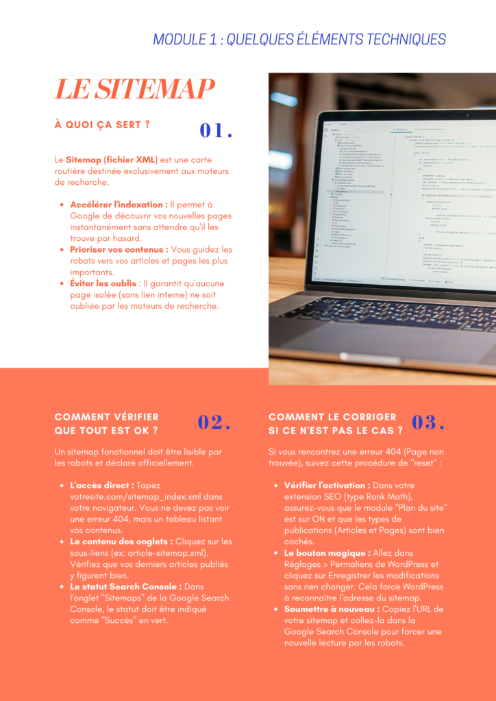 Le sitemap garantit-il la première position ? Non, il garantit que Google connaît l’existence de vos pages. Pour atteindre la première place, il faudra ensuite travailler votre contenu, mais c’est l’étape 1 indispensable.